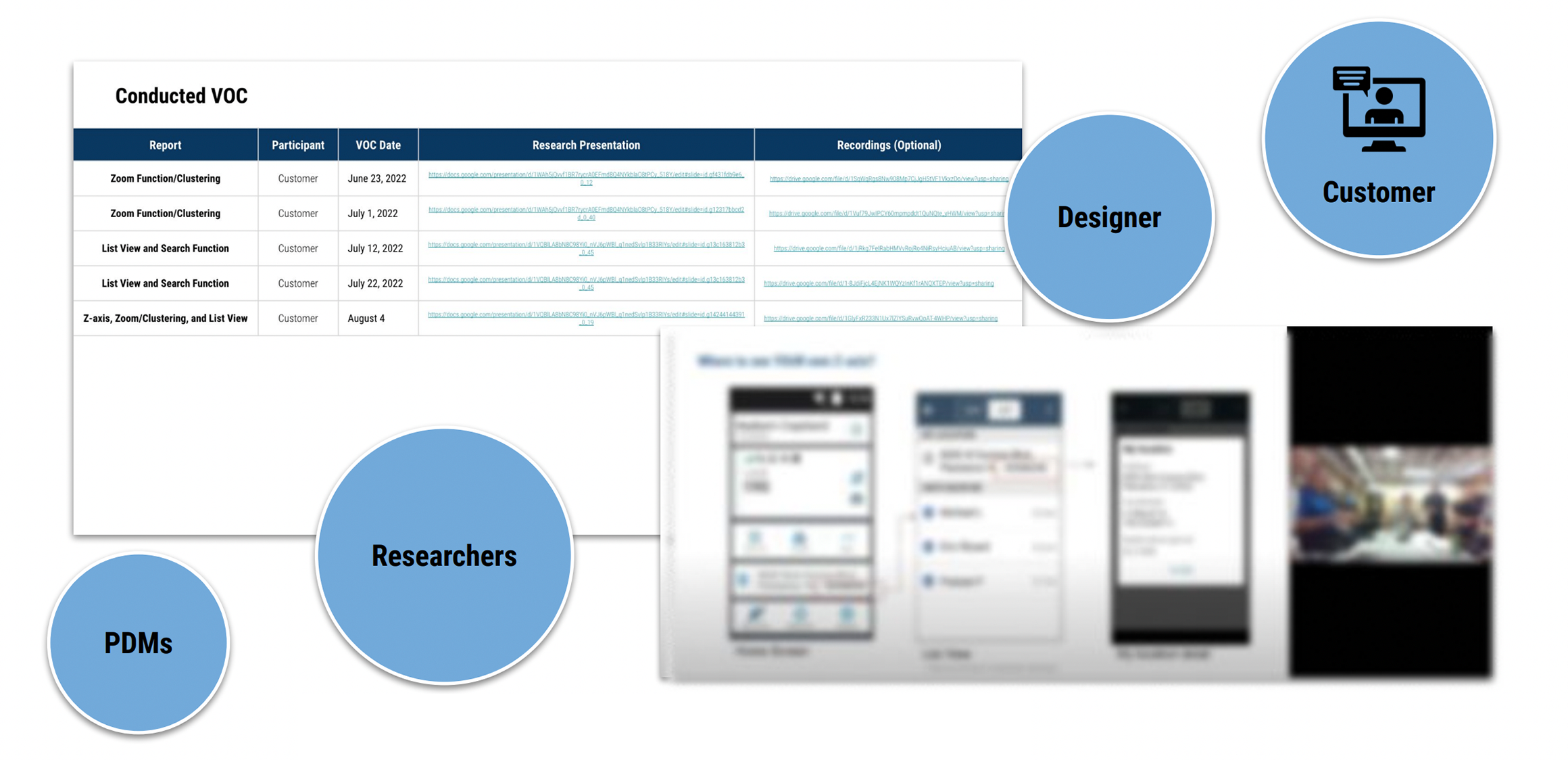 Finished with the design process, I collected topics from internal and external design reviews and any other helpful material to prepare slides for the Weekly Voice of Customer (VOC). The VOC cycles are modeled after the Agile Methodology. I focus on any other specific questions designers, researchers, or engineers may have for customers and prepare a research presentation document for customers. I review the slides with my team and scheduled interviews.